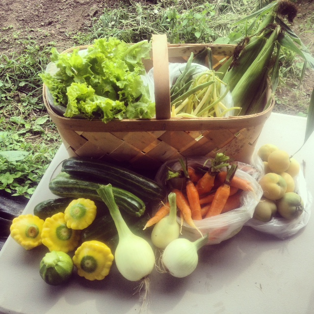 CSA Basket Week 8. Lettuce, sweet corn, beans (yellow wax, green and romano), summer squash, cucumbers (slicers and pickling), onions, carrots, tomatoes (cherry and garden peach).