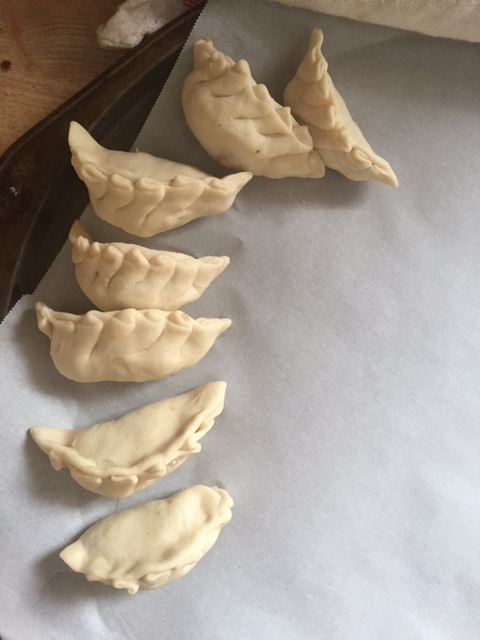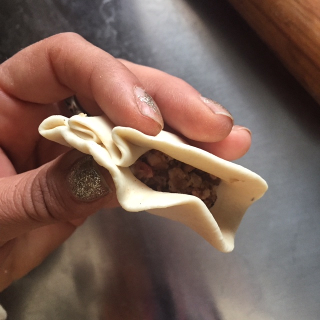 Now comes the fun part! First of all you want to take that dough in 3rds. Take one out and leave the other two wrapped up while you work. Roll the dough out into a long tube with your hands. You will want to cut about 1 inch pieces off. You will then roll them out into little circles, pretty thin. Place the circle in your hand at your fingertips and press about a tablespoon of filling into it.